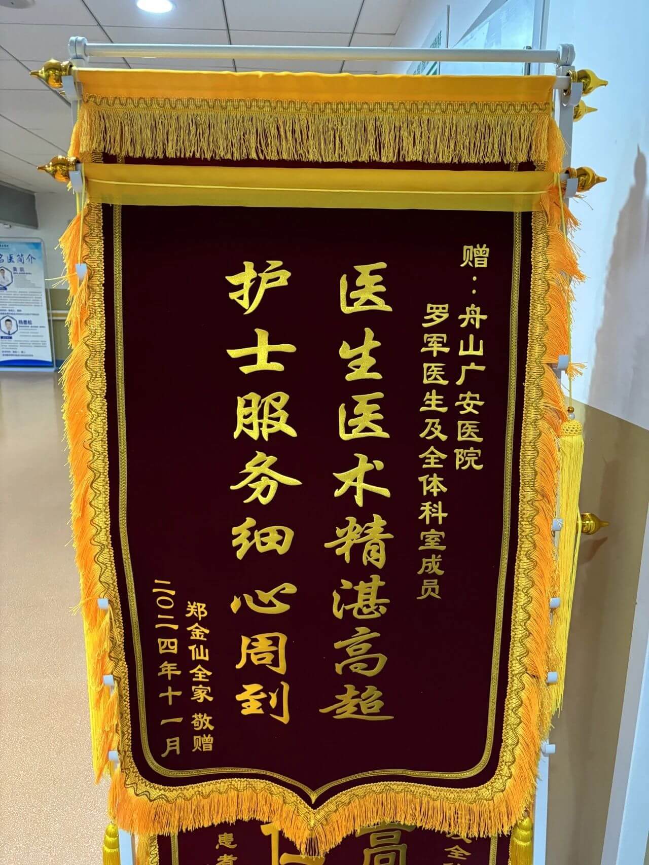 術后第一天鄭阿婆即可下地行走,看著鄭阿婆的滿臉笑容,這一刻,做為醫(yī)務人員的我們滿身的疲憊立馬煙消云散,做為兒女,看著自己84歲的老母親的對生活又重新燃起了新希望,心中感激之情油然而生,隨后便定制了錦旗向羅院長表達了深刻的感謝。