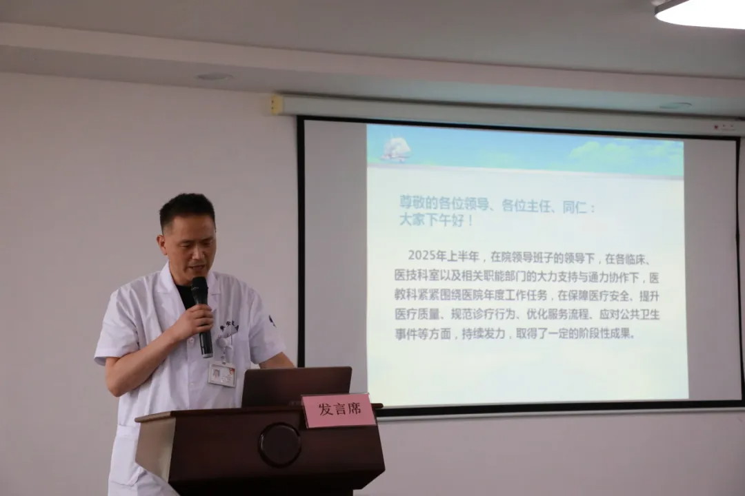 會議伊始,副院長周正作《2025年上半年工作報(bào)告》。報(bào)告指出,上半年醫(yī)院緊緊圍繞醫(yī)療質(zhì)量安全與規(guī)范化管理,各項(xiàng)工作穩(wěn)步推進(jìn):一是醫(yī)療質(zhì)量安全持續(xù)強(qiáng)化,規(guī)范診療流程,保障患者安全;二是科室管理主體責(zé)任進(jìn)一步落實(shí),管理效能顯著提升;三是學(xué)科建設(shè)與醫(yī)療技術(shù)不斷突破,新技術(shù)、新項(xiàng)目有序開展; 四是醫(yī)保及DRGS工作扎實(shí)推進(jìn),控費(fèi)管理更加精細(xì)化;五是信息化建設(shè)持續(xù)優(yōu)化,智慧醫(yī)療水平不斷提升;六是安全生產(chǎn)常抓不懈,筑牢醫(yī)院安全防線;七是社會責(zé)任積極履行,公益義診、健康宣教等活動廣受好評。