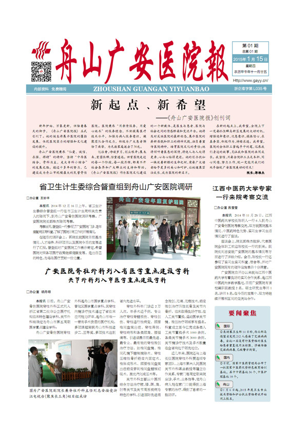 為了更好的宣傳醫(yī)院文化建設(shè),及時(shí)反映醫(yī)院的最新動(dòng)態(tài),展示醫(yī)院的嶄新面貌和職工的精神風(fēng)貌,推廣最新的醫(yī)學(xué)技術(shù)與療法,經(jīng)過(guò)前期的一系列籌備,2015年1月,《舟山廣安醫(yī)院報(bào)》正式出刊。她的誕生,將更好的搭建醫(yī)生與患者,醫(yī)院與社會(huì)的溝通橋梁,提供一個(gè)更豐富的交流平臺(tái),成為了醫(yī)院的新名片。