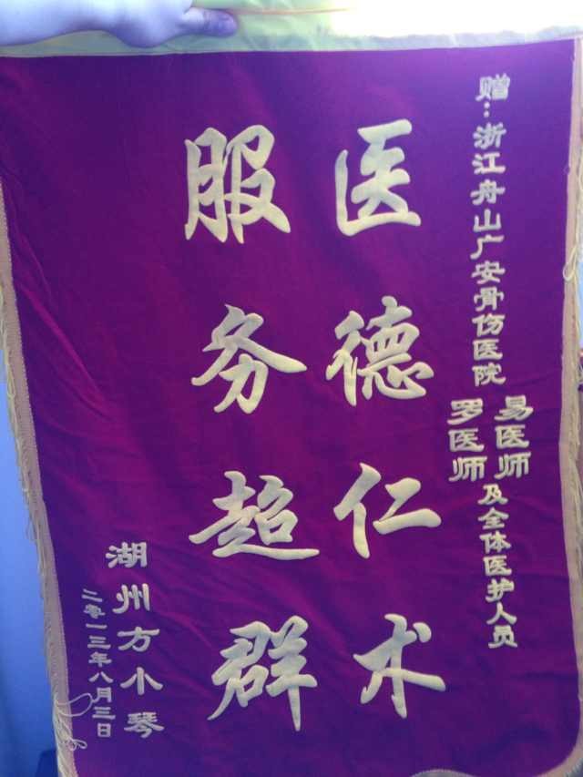 今年8月,時隔手術(shù)時間已經(jīng)一年了,方女士千里迢迢從湖州再次趕來我院,為的只是進行內(nèi)固定拆除術(shù)。其實拆除手術(shù),是一個很簡單的手術(shù),在普通醫(yī)院都能完成。可出于對我院的信任和感激,方女士特地讓兒子開車從湖州趕到舟山。手術(shù)結(jié)束后,方女士顯得激動萬分。她說:感謝廣安醫(yī)院醫(yī)生護士的高超技術(shù)以及細心照顧,讓我的腿恢復的這么好。雖然湖州離舟山要好幾個小時的車程,可是我不覺得辛苦,因為我知道這里有最好的醫(yī)生護士等著我,我對他們的技術(shù)與服務感到非常的放心。這面錦旗不值錢,可卻代表了我對廣安醫(yī)院的感激之情。