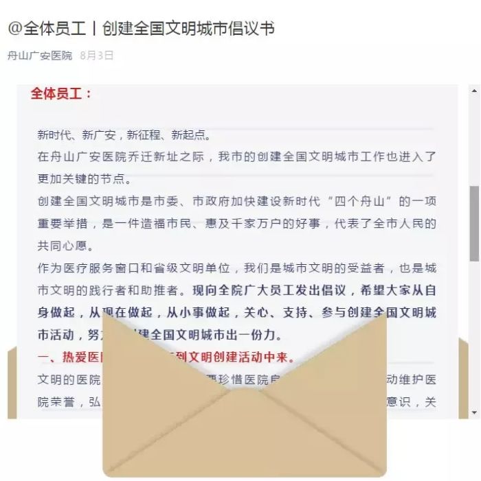 8月3日,舟山廣安醫(yī)院向全體員工發(fā)送了這樣一條微信,內(nèi)容是《創(chuàng)建全國文明城市倡議書》。