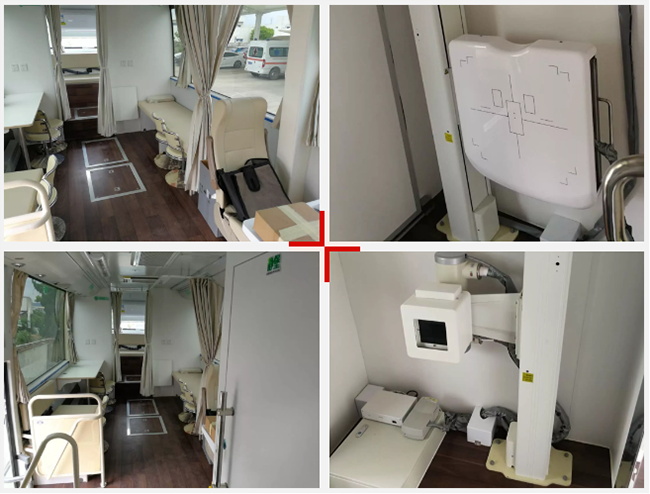 車內(nèi)配備車載數(shù)字DR、便捷式彩超、心電圖機、電測聽等先進設備;設有獨立舒適的B超檢查區(qū)、心電檢查區(qū)、采血區(qū)和先進的影像工作站等,車上配備冷暖空調(diào),流動體檢車上內(nèi)部布局合理,保證了私密性。
