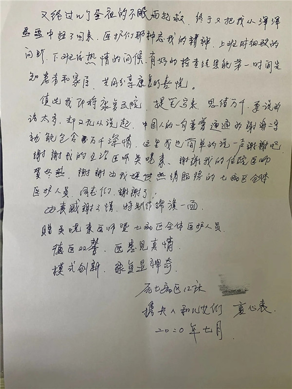 8月17日上午,在出院前,張大爺將一封手寫的感謝信及兩面錦旗分別交到了在他住院期間悉心醫(yī)護(hù)他的醫(yī)護(hù)人員的手上,以感謝他們?cè)谶@半年多來(lái)的盡心救治與關(guān)懷。