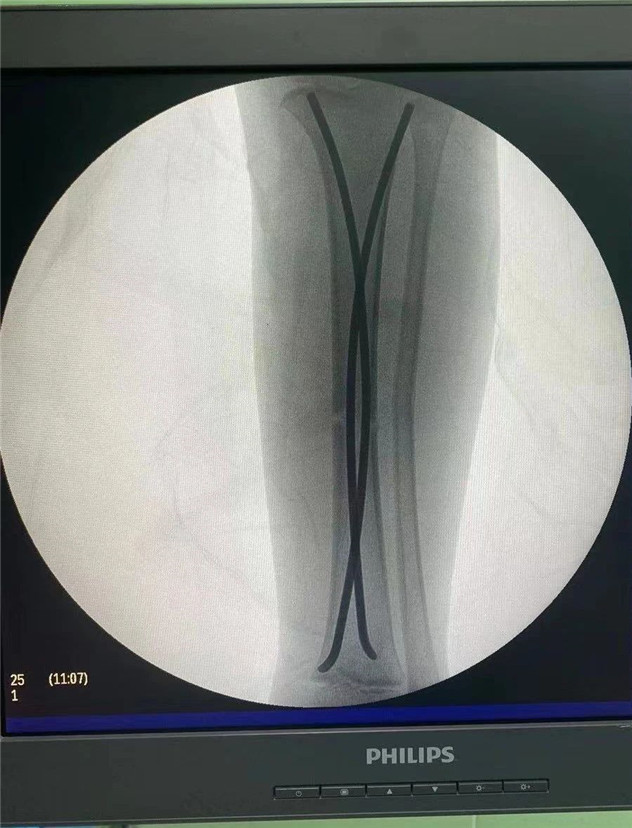 據(jù)羅主任介紹,兒童骨折絕不是成人骨折的縮小版。兒童的不穩(wěn)定性脛骨骨折或雙側(cè)脛骨骨折,保守治療很難達(dá)到理想復(fù)位,可能會(huì)造成肢體不等長、成角旋轉(zhuǎn)畸形、肌肉萎縮等并發(fā)癥。而彈性髓內(nèi)釘?shù)膽?yīng)用,正好解決了患者和醫(yī)生所擔(dān)心的問題,既理想地固定了骨折,又不影響肢體美觀,可謂一舉兩得。“彈性髓內(nèi)釘”技術(shù)可在保護(hù)骺板不受損傷的前提下,利用多點(diǎn)固定的原理,微創(chuàng)、有效地治療3—15歲的四肢長骨骨折患兒。手術(shù)在C型臂全程引導(dǎo)下,只需在骨折遠(yuǎn)、近端各切一2—3cm切口打入彈性髓內(nèi)釘,創(chuàng)傷極小,不影響孩子的骨骼發(fā)育,對(duì)于骨折的愈合以及孩子以后骨骼發(fā)育影響小。相比之下,既有效避免了切開復(fù)位鋼板內(nèi)固定創(chuàng)傷大、疤痕大等缺點(diǎn),又有效避免了支架外固定鋼針外露、不易護(hù)理等弊端。