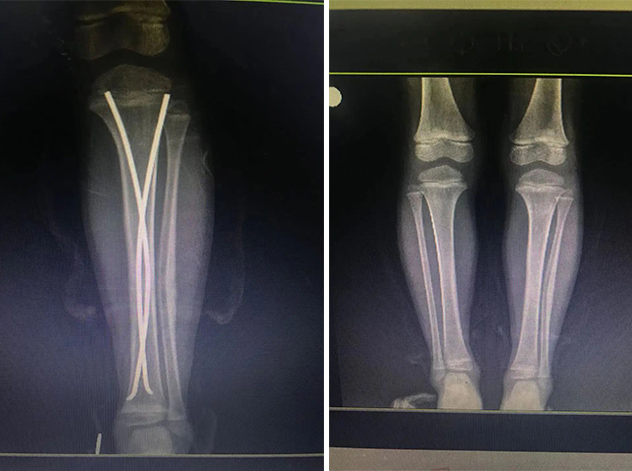 在接下來的康復(fù)過程中,睿睿非常配合,恢復(fù)的非常好。今年4月12日,睿睿拆除了左腿里的彈性釘。