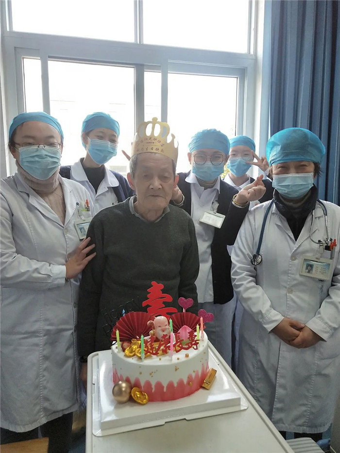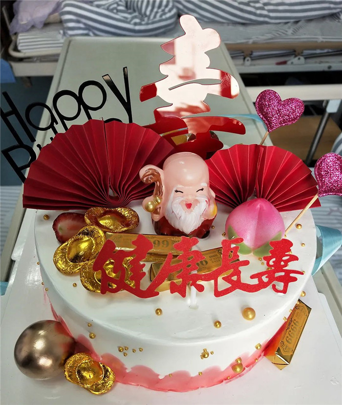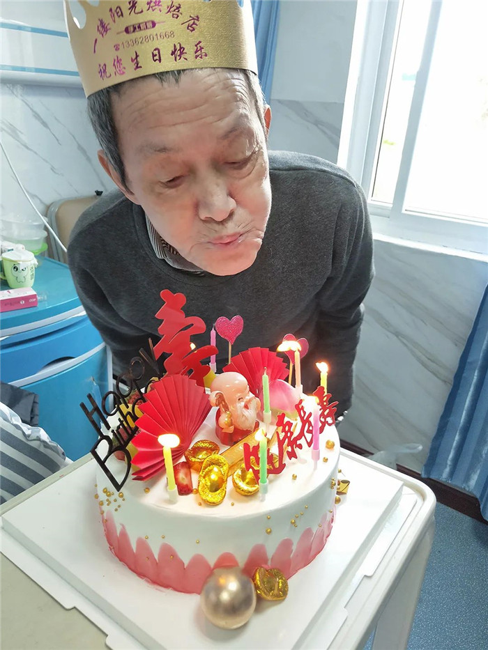 當(dāng)單主任帶著眾多醫(yī)護(hù)人員捧著蛋糕進(jìn)入病房時,陳阿公感動得無以言表。戴上生日帽,點上蠟燭,唱起生日快樂歌,陳阿公的臉上,洋溢著幸福的笑容。