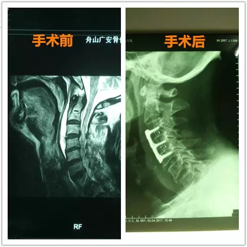 臘月二十六,王阿伯成功接受了由劉志安院長(zhǎng)主刀的頸前路減壓植骨融合內(nèi)固定術(shù)。術(shù)后王阿伯的病痛迅速得到緩解,雙肩以下上肢疼痛立馬改善,雙手肌力有所恢復(fù),雙上肢已能抬舉。術(shù)后恢復(fù)情況也非常理想,術(shù)后3天王阿伯即可下地行走,并于術(shù)后1周后拆線出院。出院時(shí)檢查時(shí),王阿伯雙上肢抬舉過頭頂,雙肩以下上肢疼痛消失,雙手腕以下皮膚感覺遲鈍較前明顯好轉(zhuǎn),雙上肢各關(guān)節(jié)活動(dòng)恢復(fù)接近正常。