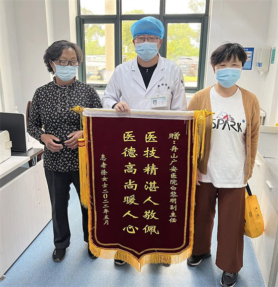 5月26日,徐女士的家人來到舟山廣安醫(yī)院,她們手里拿著繡著“高醫(yī)技好醫(yī)德 待病人如親人”、“醫(yī)技精湛人敬佩 醫(yī)德高尚暖人心”的錦旗,表示要將這兩面錦旗送到骨科中心羅軍主任和白黎明副主任的手中,向他們表達自己真摯的感激之情。