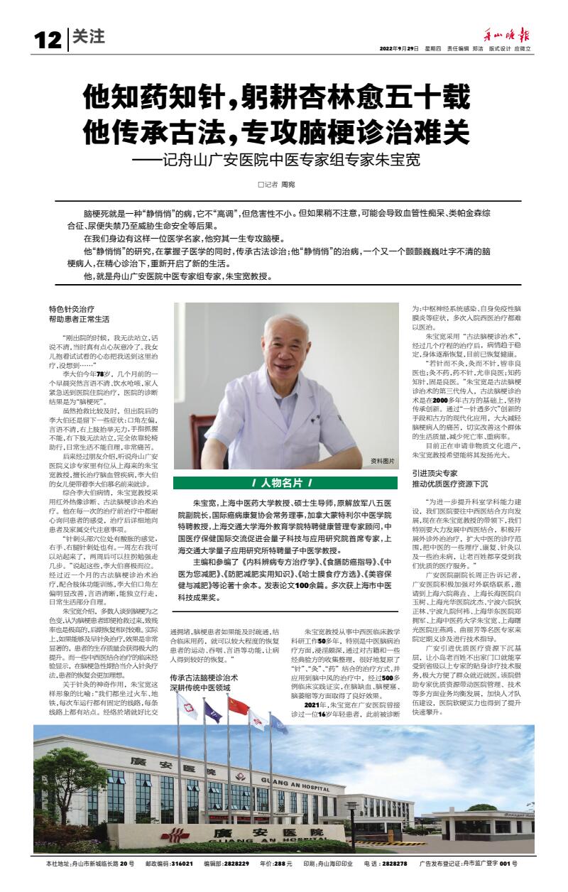 “若針而不灸,灸而不針,皆非良醫(yī)也;灸不藥,藥不針,尤非良醫(yī);知藥知針,固是良醫(yī)。”朱寶寬是古法腦梗診治術(shù)的第三代傳人,古法腦梗診治術(shù)是在2000多年古方的基礎(chǔ)上,堅持傳承創(chuàng)新。通過“一針透多穴”創(chuàng)新的手段和古方的現(xiàn)代化應(yīng)用,大大減輕腦梗病人的痛苦,切實改善這個群體的生活質(zhì)量,減少死亡率、重病率。