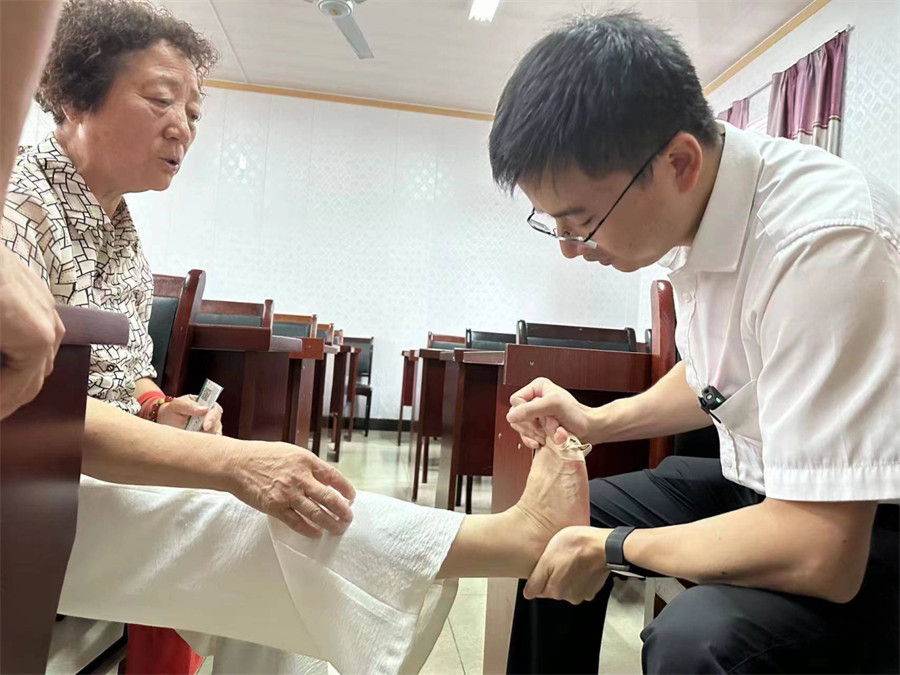 講座結束后,兩位教授現(xiàn)場為村民開展義診咨詢活動,針對群眾骨性關節(jié)炎、肩關節(jié)疼痛、膝關節(jié)疼痛、髖關節(jié)疼痛、腰腿痛、頸肩痛等常見慢性病進行現(xiàn)場咨詢,給予健康指導。隨行的醫(yī)生為當?shù)鼐用衩赓M提供測血壓、測血糖、按摩、針灸等中醫(yī)診療服務,對于年邁、行動不便的老人則分批上門走訪。