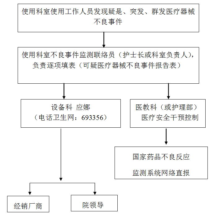 5.2.1全院各臨床科室發(fā)現(xiàn)醫(yī)療器械突發(fā)性群體不良事件時,應(yīng)及時向設(shè)備科辦公室報告,不得瞞報、遲報或授意他人瞞報、遲報。