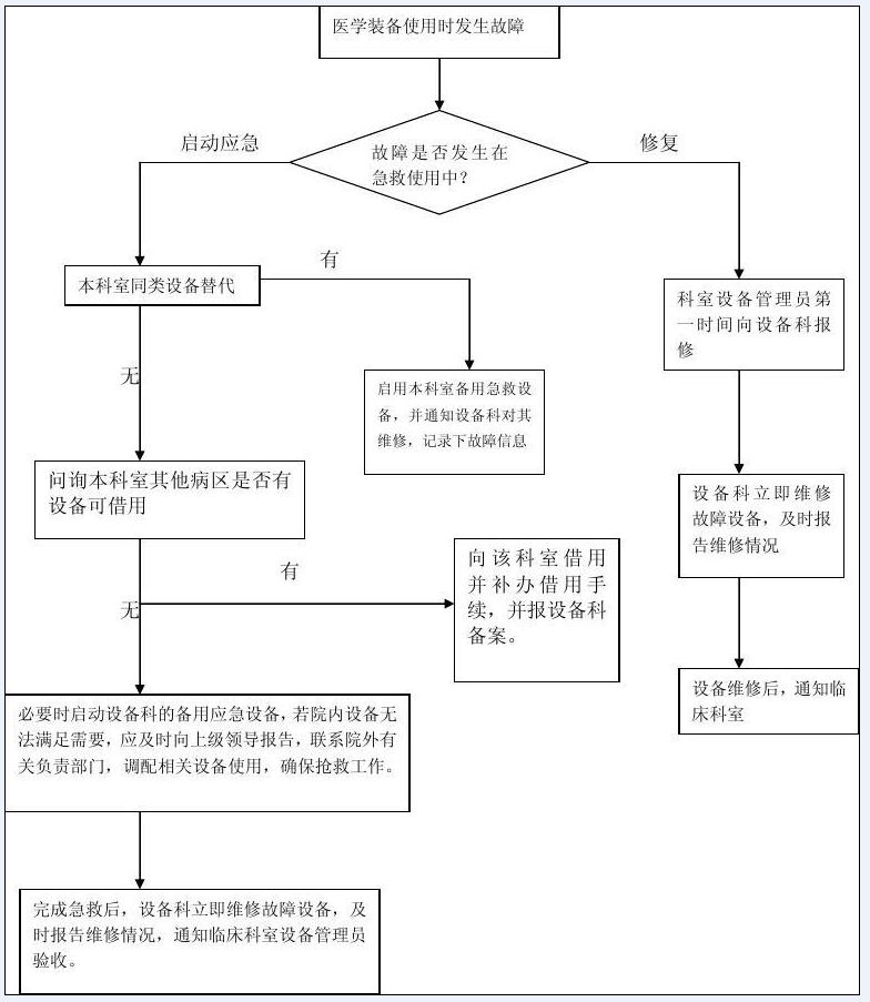 5.7設(shè)備科根據(jù)故障性質(zhì)程度,決定是否由其他相關(guān)科室調(diào)撥裝備或院外借用,以保證病人的救治,使裝備故障對病人救治造成的影響程度降至最低。