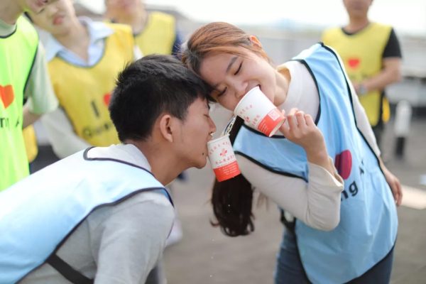 參賽的青年醫(yī)護人員分為藍(lán)、綠、橙、黃四組,分別在四方拔河、集群尋寶、借力倒水、智力猜謎、速吸酸奶、即興演唱等項目上展開角逐。
